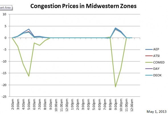 This is supported by the data. As the chart below shows, pick a day and look at congestion prices in the real time market. Congestion prices kick in when there is heavy use of the transmission system but the lowest price electricity cannot get to the destination. In these cases, the price of energy is lower at the sending end and higher at the receiving end. In other words, people pay more for electricity but the generators get less compensation. As you can see, transmission congestion prices skyrocket in the COMED Zone — which contains the Chicago General Hub, the Chicago Hub, and the Northern Illinois Hub. The recent market monitor report confirms that COMED was the second most congested zone so far in 2013.