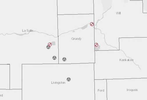 Exelon’s problem isn’t the PTC having a distortionary effect, it is that the PTC has made building wind turbines more competitive, and now that cheap wind power is contributing to oversupply in a particular region. The map below shows just how close nuclear plants (the little red circles) and wind turbines (the grey ones) are located together right outside Chicago.