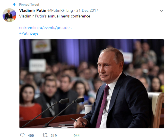To wit, the account’s pinned tweet was simply a link to Putin’s annual news conference. And its very first tweet set the tone for those following, reading simply, “Congratulations to US President-elect Barack Obama.”