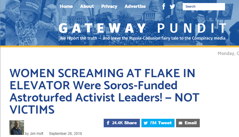 Not to be outdone by Big League Politics, another fester of conspiracy theories, Gateway Pundit, went a step further. Where Ingraham at least acknowledged that the women were victims of assault, Gateway Pundit’s post blared that the “WOMEN SCREAMING AT FLAKE IN ELEVATOR were Soros-Funded Astroturfed Activist Leaders! — NOT VICTIMS.” Naturally, the post provided no proof of its claims.