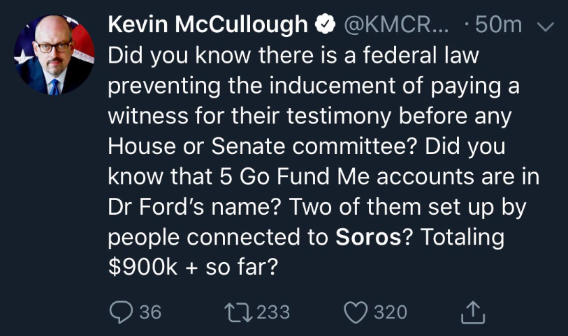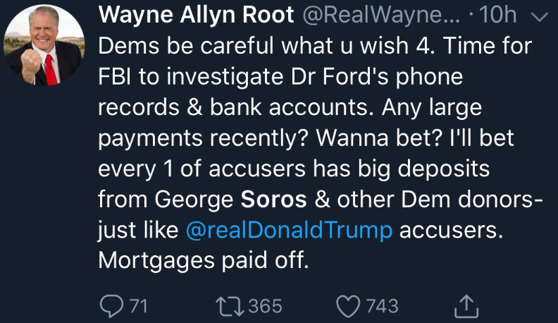 Others, likewise, pushed conspiracies about Soros and Kavanaugh. For instance, conspiratorial radio hosts like Kevin McCullough and Wayne Allyn Root — who recently opened for Trump’s speech in Nevada — both refused to believe that Dr. Christine Blasey Ford’s claims could be authentic, but were instead tied to some kind of Soros-linked operation to thwart Kavanaugh.