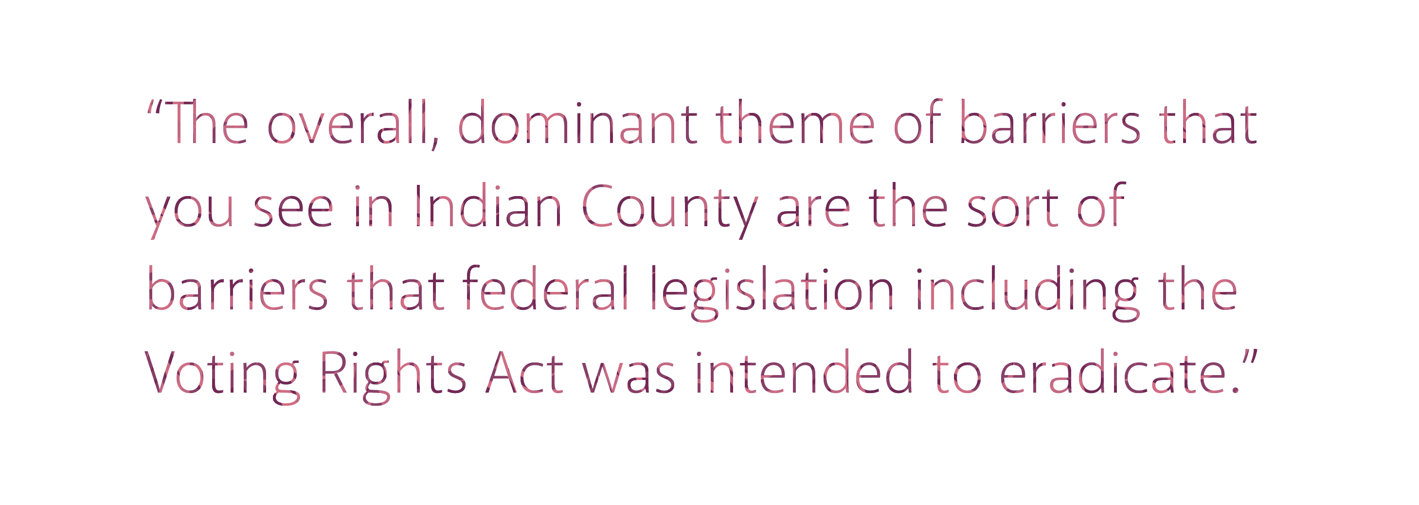 “The overall, dominant theme of barriers that you see in Indian County are the sort of barriers that federal legislation including the Voting Rights Act was intended to eradicate,” Tucker said. “They are just entrenched in many parts of the country and it makes it much more difficult to bring litigation because there’s no simple, magic bullet fix now. You have to address many, many different issues in order to provide equal opportunities to participate and elect candidates of choice.”
