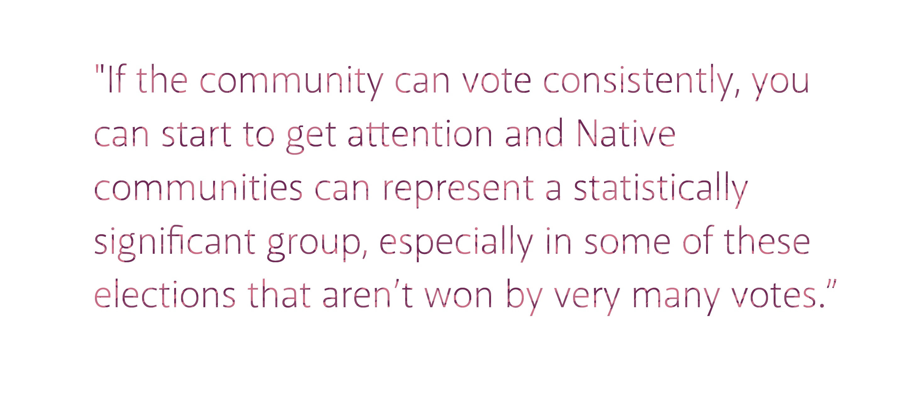 “There needs to be … a reconciliation — which is obviously a huge order, between tribes and their local communities — and an acknowledgement and an acceptance and an encouragement of participation,” she said. “If the community can vote consistently, you can start to get attention and Native communities can represent a statistically significant group, especially in some of these elections that aren’t won by very many votes.”