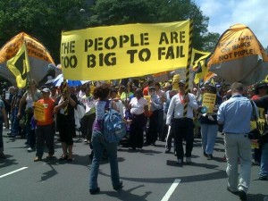Using tactics and rhetoric familiar from 2011’s Occupy Wall Street demonstration, a group of activists and foreclosed homeowners marched on the Justice building in downtown Washington, D.C. According to tweets and photographs from activists on the scene, protesters moved past a police barricade and attempted to establish a sit-in, at which point police began arresting homeowners and activists.
