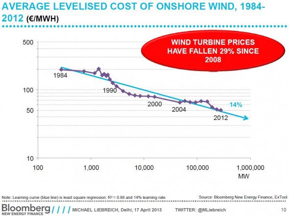 It’s not just solar. This one shows the steady decline in wind turbine prices — 29 percent since 2008: