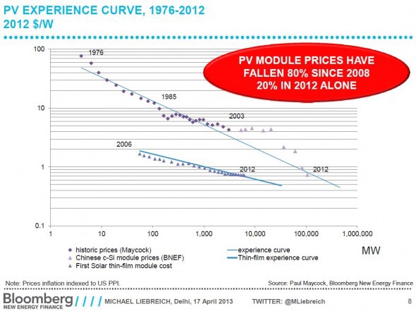 His graph is backed up by the pros. In Bloomberg New Energy Finance’s presentation (pdf) to the Clean Energy Ministerial last month, this slide shows that solar panel prices fell 80 percent in the last 5 years: