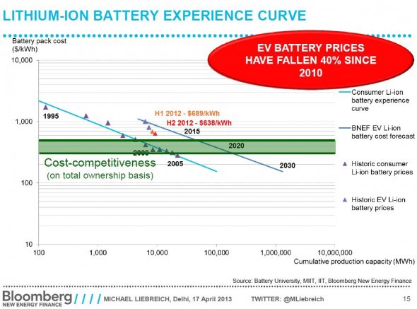 The skeptic might say “that’s all well and good, but storage technology is not feasible and what exists today is far too expensive — some cars will always need gasoline.” Not so: lithium-ion battery costs dropped 40 percent in the last three years: