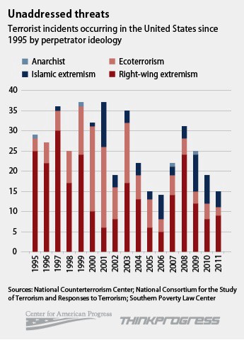 While the scope of King’s assertion is unclear, the reality is that a small percentage of terrorist attacks and plots in the U.S. are the result of Islamic extremism — 56 percent have been perpetrated by right-wing extremists, 30 percent by ecoterrorists and 12 percent by Islamic extremists: