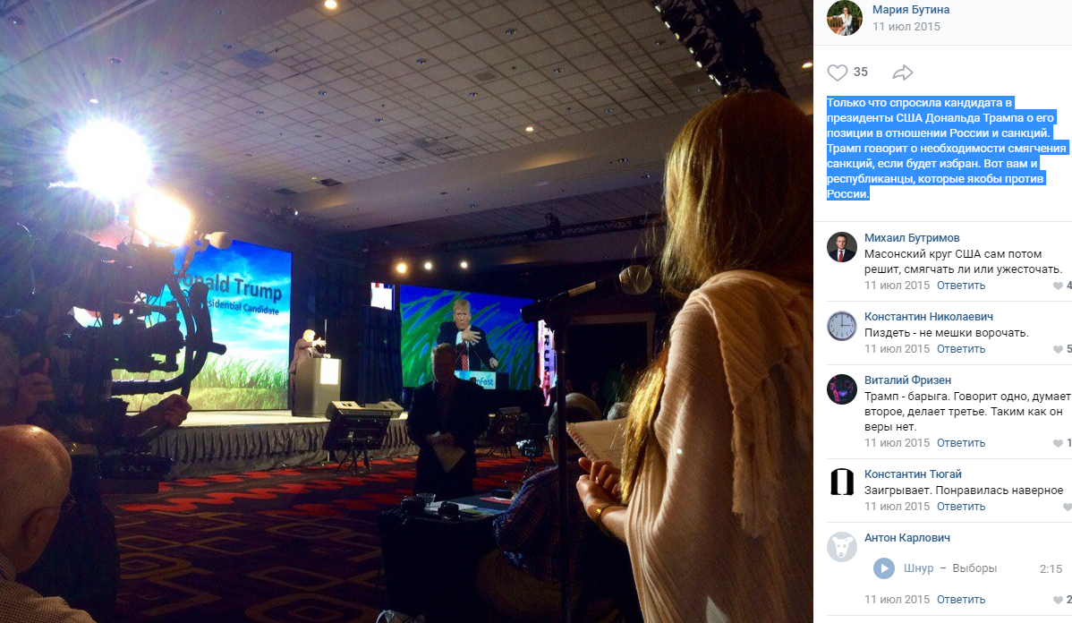 Butina, for instance, asked then-candidate Donald Trump about sanctions on Russia in 2015 — a policy Trump hinted he would do away with.