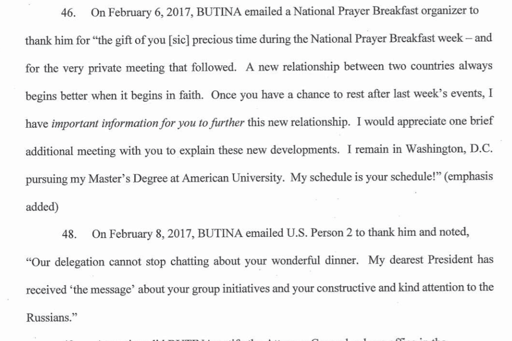Perhaps most damning, though, is that this unnamed American apparently helped organize Butina’s and Torshin’s events surrounding the 2017 National Prayer Breakfast. As Butina wrote to “a National Prayer Breakfast organizer,” “I have important information for you to further this new relationship” between Russia and the U.S.
