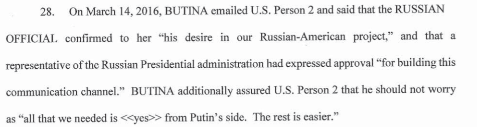 Butina wrote to the second unnamed American that Putin “has received ‘the message’ about your group initiatives and your constructive and kind attention to the Russians.”