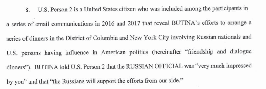 The identity of the second unnamed American is unclear. This American had multiple interactions and emails with Butina, especially just after Trump’s inauguration. We know, for instance, that this American was “among the participants in a series of email communications… that reveal [Butina’s] efforts” to arrange meetings between Russian nationals and influential Americans.