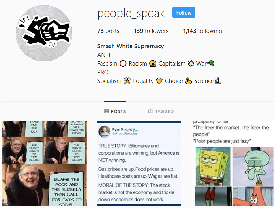 Many, unsurprisingly, also aimed at Democrats and liberals, with pages like “New Blue Wave” now taken down. One, “People Speak,” targeted those opposing racism, with a bio reading “Smash White Supremacy.” The page took particular interest in those supportive of socialism and antifa.