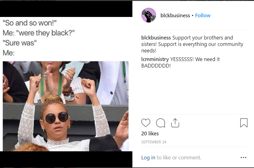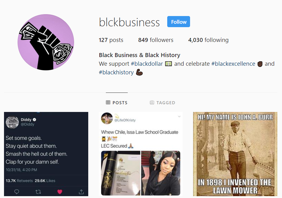 Another page, “Black Business,” claimed to post material related to African-American business accomplishments. “We support #blackdollar and celebrate #blackexcellence and #blackhistory,” the account’s bio read. Other similar pages were “Black Roots,” “Black Boy Joy,” and “Black Nation.”
