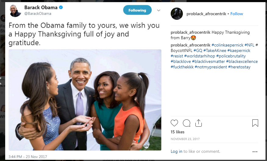 After all, it’s not as if these accounts went up overnight. As the first “ProBlack Afrocentrism” post wrote, “Happy Thanksgiving from Barry,” posting a picture of the Obama family. The date it went up? Nov. 23, 2017.