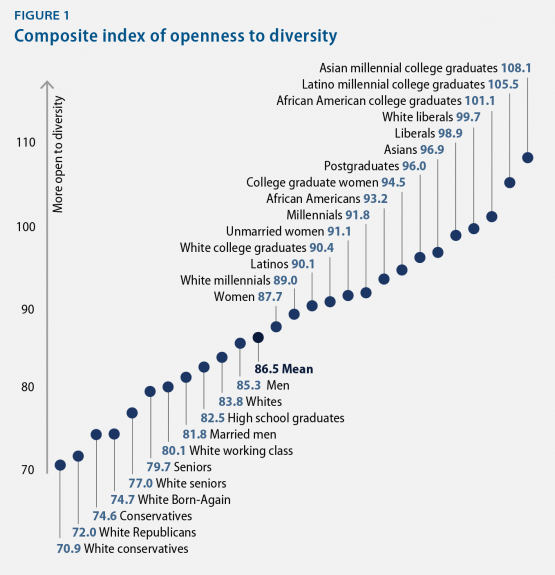 Although these new results should be replicated by additional studies, the conclusions are nonetheless striking. White liberals think far more like the bulk of African-Americans, Latinos and Asians than white conservatives on the country’s biggest ideological questions. That’s particularly true on diversity questions: