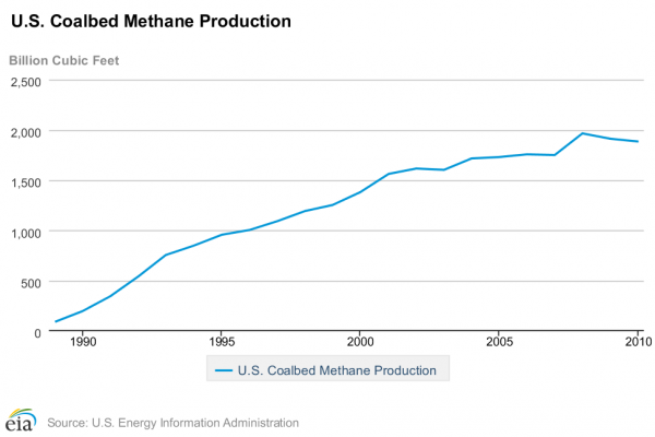 According to the U.S. Energy Information Administration, as of 2010 there were 18 trillion cubic feet of coal-seam gas reserves in the U.S. and 0.18 trillion cubic feet of production, about three-quarters of which occurs in Colorado, New Mexico, and Wyoming. For comparison, in 2010 there were 97 trillion cubic feet of shale gas reserves and 5.3 trillion cubic feet of estimated production.