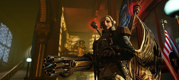 So when Bioshock Infinite’s protagonist is introduced in the year 1912 with a box inscribed “Booker DeWitt, 7th Cavalry, Wounded Knee,” we associate him first with one of America’s great crimes. Within minutes he’s rocketing into the air and being “reborn” in baptism as a condition to enter the sky-city of Columbia. He emerges from the water into a chapel garden built to honor Columbia’s religious idols: Jefferson, Franklin and Washington. Columbia isn’t so much a living city as a museum through which Booker makes his way, taking time out between effervescent gunfights to admire distant statuary through public coin-op binoculars. There’s even a lengthy sequence in a history museum, where Booker is fed “revised” accounts of Wounded Knee along with the Boxer Rebellion.Columbia is America frozen in that golden Past, built to realize the fantasies of the wealthy. Surly, articulate black janitors are suddenly mealy-mouthed and servile when white people approach. A gaggle of woman talk about a friend who got herself pregnant, left town for a few months and will return “like nothing ever happened.” These people are trying to live in the golden Past and the messy future all at once. It’s no coincidence that, through interdimensional meddling by city’s Founders, they’re constantly creating new memories and confusing themselves. Past fantasies run aground on present realities.