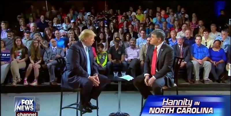Hannity’s role is less of an interviewer than a member of Trump’s campaign staff. During his appearances, Hannity seeks to tamp down controversies, talk up Trump’s poll numbers, and tout his policy proposals. Hannity’s Trump is a reliable conservative with specific ideas who isn’t afraid to take on “PC” culture. Trump’s critics in the media, according to Hannity, are “dumb” “idiots” who don’t understand what’s happening in America.