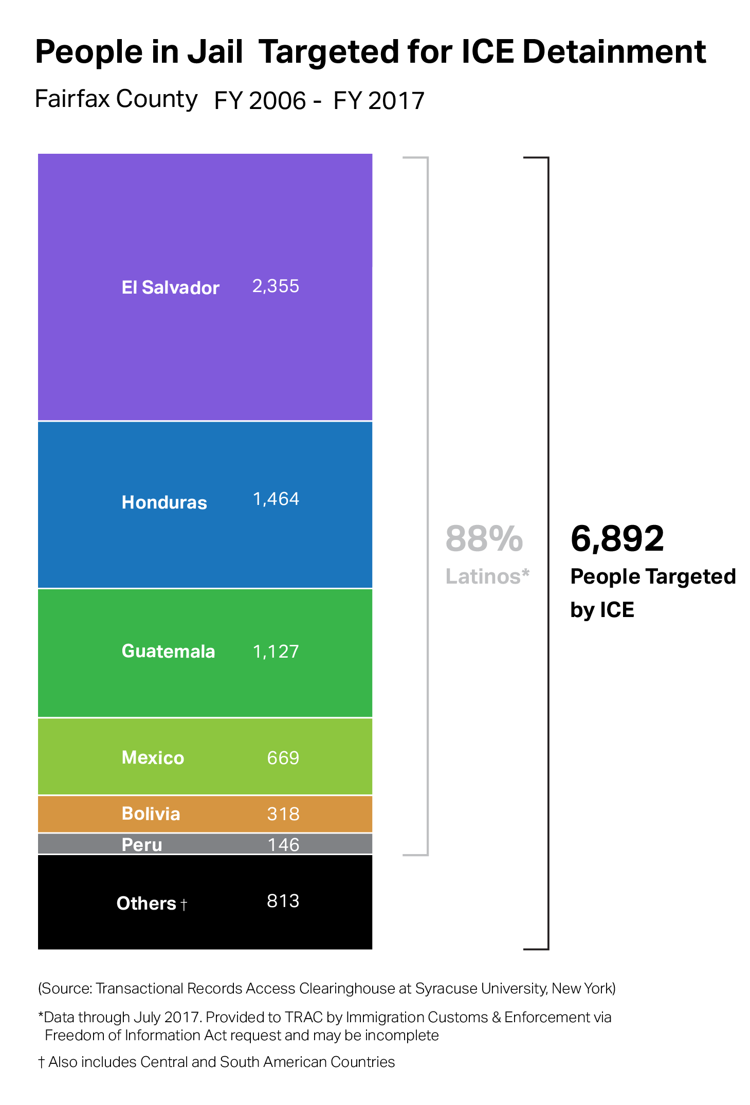 In Fairfax County, this ICE tactic has overwhelmingly impacted Latino detainees, who are being held for immigration authorities and kept behind bars despite having completed their time in the local jail, had their charges lifted, or been otherwise ordered released by courts. The federal courts have recently ruled that this procedure constitutes an arrest, because the person is kept in jail beyond their release date.