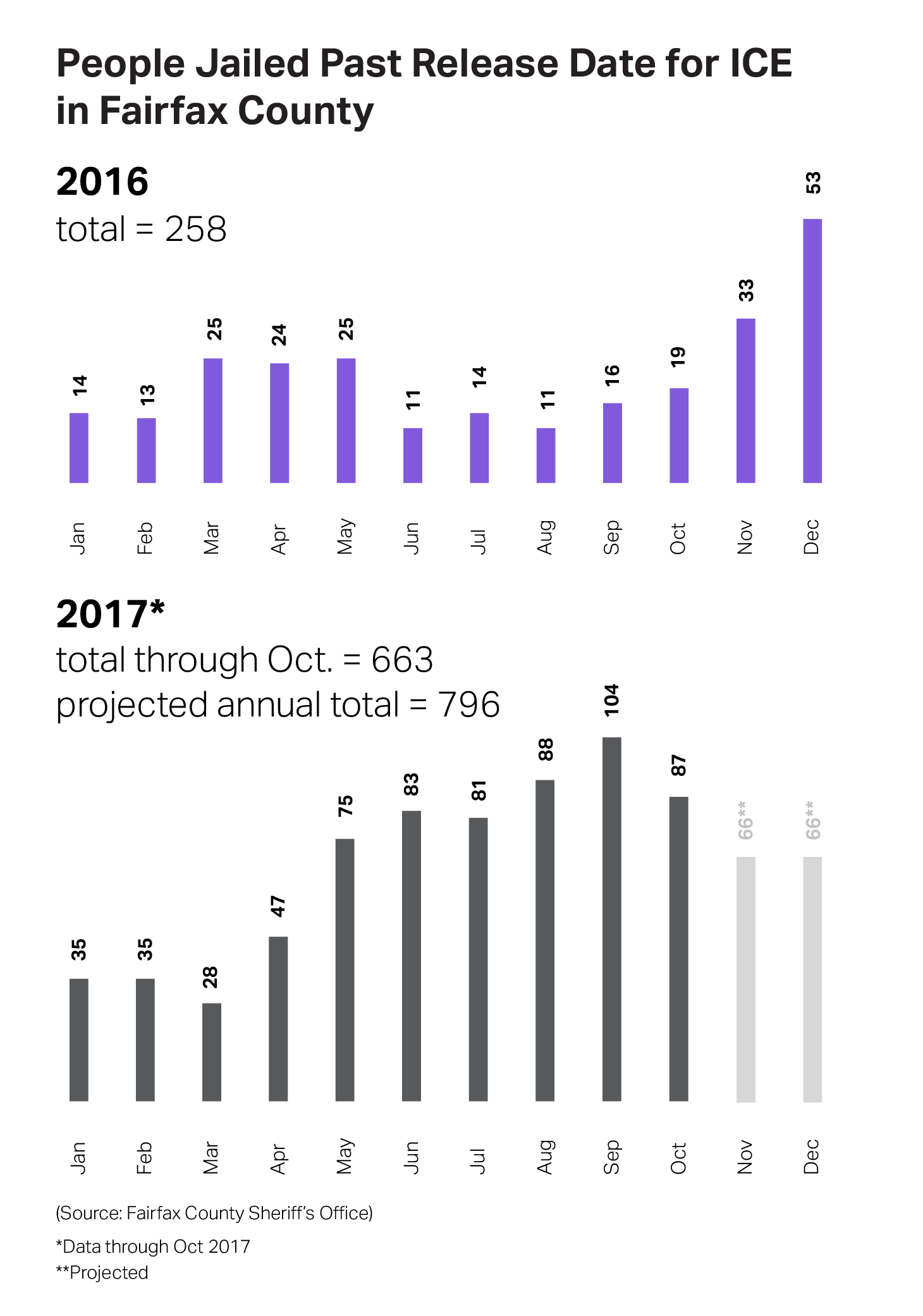UPDATE 1/24/18: The Fairfax County Sheriff’s Office announced Tuesday that it will cancel its detention contract with federal immigration authorities and will no longer hold people in jail past their release date for Immigration and Customs Enforcement (ICE) unless the request is accompanied by a court order. Read more here.