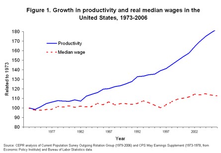 The basic liberal line is that middle class wages have stagnated for decades while the rich have gotten richer. I think you can make a credible counterargument that since the CPI doesn’t properly account for “new goods” (nobody had an iPhone or a DVD player in 1988, etc.) that this factoid is unduly bleak and actually there have been modest improvements in living standards due to the improvements in available gadgets. Alternatively, you could argue that this is offset by things like the increase in commute times, the decrease in air travel quality, and other elements of quality of life that have been on the decline. What you can’t really argue with is this chart that shows that something’s gone amiss: