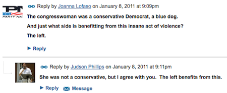 Tea Party Nation founder Judson Phillips organized the national Tea Party Convention in 2010 where keynote speaker Sarah Palin cried, “America is ready for another revolution!” Phillips now argues that the Tucson massacre is part of the “war” between the left and the Tea Party. Managing the online forum at Tea Party Nation, he has encouraged his members to argue that accused killer Jared Loughner is a “liberal lunatic” in order to fight against “the masters at the dark arts of media and politics” who are trying to “take over our country.” Railing against the specter of gun control reform, Phillips warns that “we cannot allow liberals to use this tragedy to try and continue to strip our rights.” By Monday afternoon, he was arguing that “liberals want to destroy liberty and freedom in this country.” Agreeing with a member who believed the massacre is good for liberals, Phillips said that “the left benefits from this”: