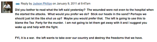 “It is a war,” Phillips explained in another comment posted Sunday morning, between the Tea Party and “the left” who want to “destroy the freedoms that we have”: