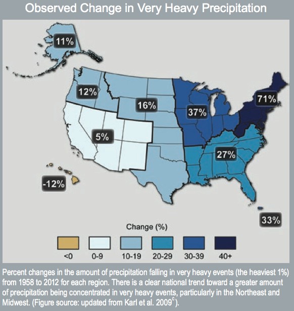 Those of you in the Northeast who thought you’d noticed deluges becoming more intense were right. Thanks to climate change, when it rains, it pours, literally. Ironically, what this means is that even in the regions that are expected to see a drop in precipitation, more of the precipitation they do get will be in the form of deluges, which are so intense they can wash away topsoil and generally fail to alleviate droughts.