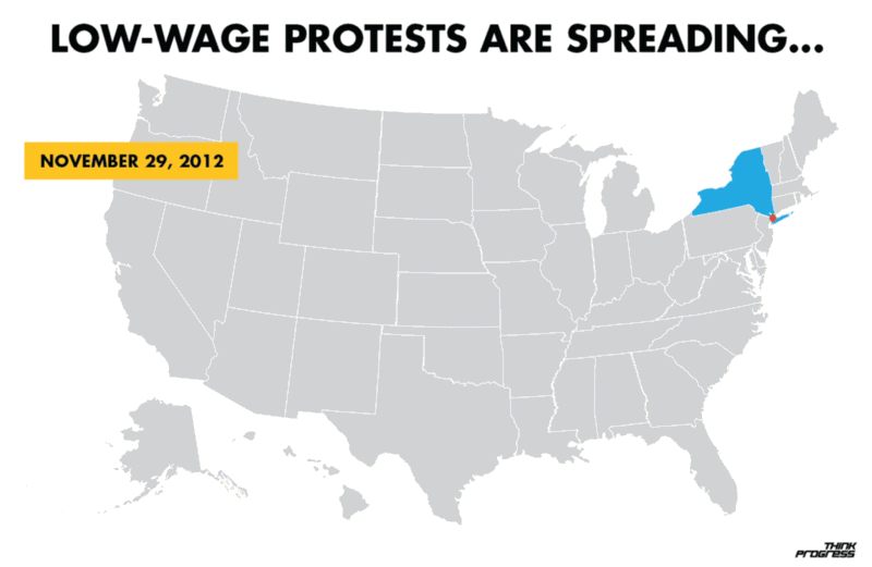 The fast food strikes began on November 29, 2012, with workers at a Manhattan McDonald’s. A few months later, a larger group of New York City fast food workers walked out. Then low-wage workers in Chicago got in on the act two weeks later. Last May, the strikes jumped to Detroit, St. Louis, Milwaukee, Washington D.C., and Seattle.