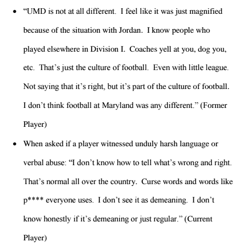 This week’s report was supposed to focus in on the culture of the program and the accountability of individuals. It describes the lack of institutional support the Maryland establishment provided the football program, the disturbing and emotionally toxic motivational tactics employed by Court and Durkin, and the many ways players were silenced, overworked, and undervalued in the football program.
