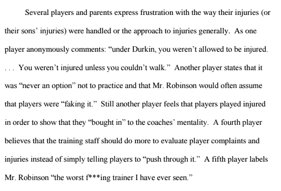 One player’s anonymous comment is particularly damning: “[U]nder Durkin, you weren’t allowed to be injured… You weren’t injured unless you couldn’t walk.”