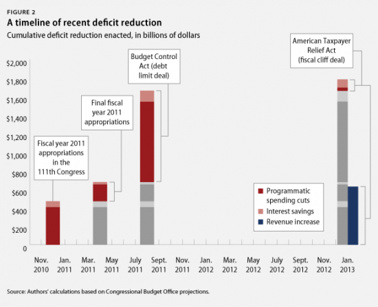 Between the budget deals in the spring of 2011 and the Budget Control Act, which averted the debt ceiling crisis that same year, spending has been cut by $1.5 trillion and interest payments reduced by another $200 billion. Then the American Taxpayer Relief Act, which solved the impasse over the “fiscal cliff,” raised $600 billion in new tax revenue.
