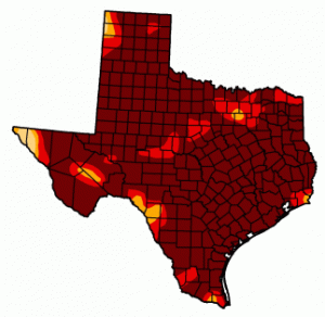 Oops, that’s the US Drought Monitor for Texas this week! Dark red is “exceptional drought” (covering 86% of the state) — virtually no rain for a year. Red is “extreme drought” (covering 97% of the state) — a Palmer Drought Severity Index of -4 or worse.