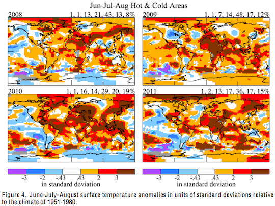 Figure 4 reveals that the area with temperature anomaly greater than +2σ covers 20–40 percent of the planet in these recent years, and the area greater than +3σ is almost 10–20 percent. The United States has been relatively ‘lucky’, with the only +2–3σ areas being the Texas region in 2011 and a smaller area in the Southeast in 2010. However, these events are sufficiently fresh in people’s memories that they provide a useful measure of the practical impact of a 3σ anomaly.