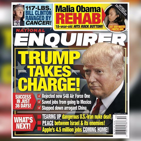If the transition period is any indication, it might well look a lot like your neighborhood supermarket check-out line. The National Enquirer—publisher of such exclusives as Michelle Obama’s 2014 divorce from President Barack Obama and Hillary Clinton’s six month death sentence fifteen months ago—has been among Donald Trump’s most visible boosters since the election.