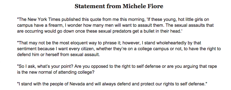 Assemblywoman Michele Fiore’s initial comments were published in the New York Times on Wednesday. The lawmaker was defending her sponsorship of a bill that would allow college students to carry concealed firearms, saying that expanding students’ right to have hidden guns will help address the sexual assault crisis.