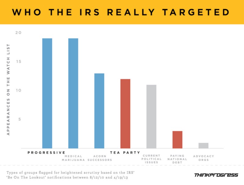 In Issa’s committee’s recent report, “Debunking the Myth that the IRS Targeted Progressives,” the Republican majority staffers wrote that while the Be On the Lookout lists’ language was “changed to broader ‘political advocacy organizations,’ the IRS still intended to identify and single out Tea Party applications for scrutiny.” The report goes to great lengths to distinguish the different types of scrutiny provided to each of these types of flagged group. But the actual IRS records indicate that at least some additional scrutiny was required for groups of all types that had names that sounded political — and that the explicit heightened scrutiny for left-leaning groups was even longer-standing than for Tea Party groups.