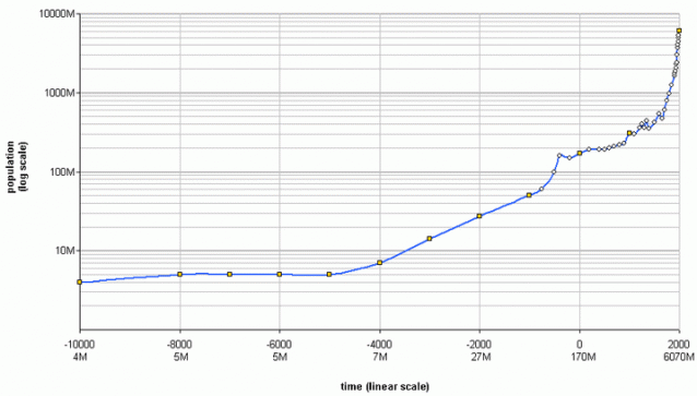 Here is a better graph from Wikipedia in which time has a linear scale but population is plotted logarithmically: