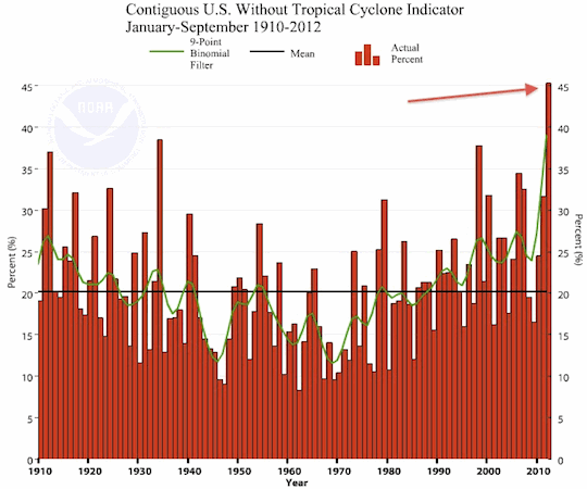 And so I can also say, not coincidentally, NOAA’s National Climatic Data Center (NCDC) reported Tuesday in its “State of the Climate” for September that the Climate Extremes Index for the period January-through-September was over the highest ever — and over twice the average value — since record-keeping began in 1910.