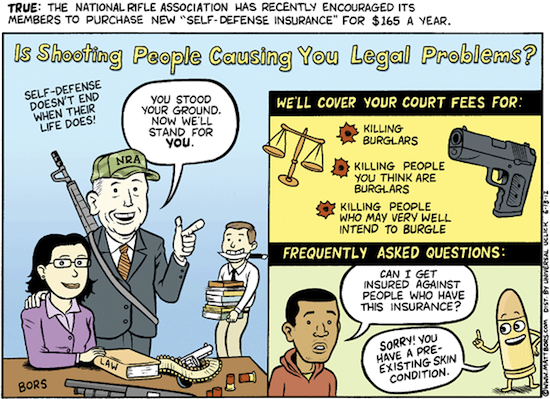In a rare “scoop” for an editorial cartoonist today, Matt Bors skewered a little-known National Rifle Association (NRA) program that offers insurance to cover policy holders’ costs should they become embroiled in a legal battle after shooting someone in self-defense.