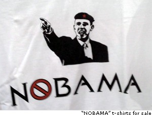 One vendor with Liberty Firearms was wearing a button with Obama’s name crossed out and warned a couple, “Get ready for the Obamanation.” He told us that he was actually having trouble restocking and ordering new wares because suppliers were canceling orders and getting ready to dramatically increase prices to take advantage of the hype, as they did in 1994. The man selling the “NObama” shirts said that his business was also way up. “People are afraid,” he said.