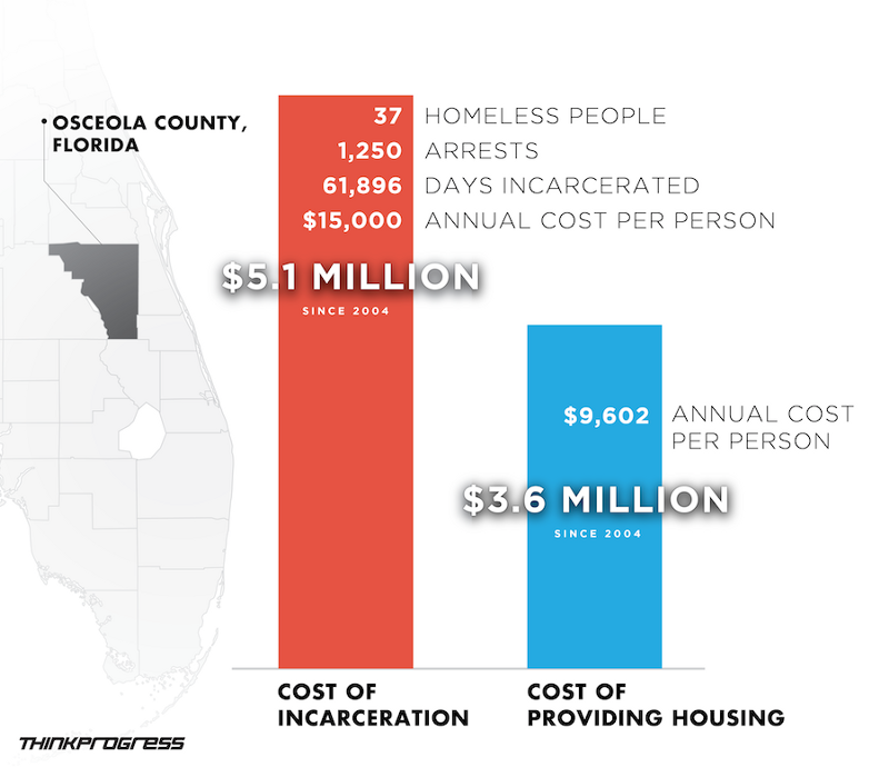 A far cheaper option than criminalizing and jailing the homeless is to provide them with permanent supportive housing. An average permanent supportive housing unit in Osceola County costs $9,602 per year, which includes $8,244 for rent and utility subsidies and $1,358 for a case manager (with a case load of 30 clients). In other words, each supported housing unit costs the county 40 percent less than what they’re currently paying to put homeless residents in jail.