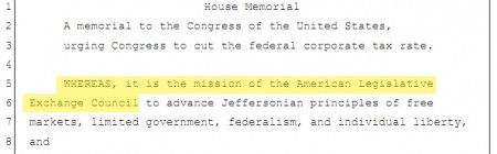Funded almost entirely by large corporations, ALEC produces “model legislation” favorable to industry that state lawmakers can introduce as their own bills. Usually, the legislators tweak the language of the bills to make them state-specific or to obfuscate their origins. Usually, but apparently not always.