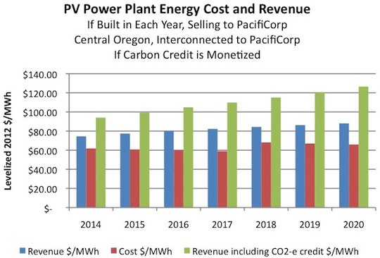 The economic performance of a solar power plant built in Central Oregon and interconnected to PacifiCorp’s transmission and distribution system. The energy would be sold to PacifiCorp via a long-term power purchase agreement (PPA). PPA revenue is based on the utility’s 2012 avoided cost rates as regulated by the Oregon Public Utility Commission (PUC). The levelized $/MWh is shown for the production cost (red bars), PPA revenue (blue bars) and PPA revenue plus the value of avoided carbon emissions (green bars).