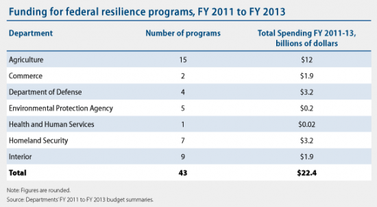 A CAP review of federal resilience spending in FY 2011 through FY 2013 identified 43 programs in seven cabinet departments that invest in extreme weather resilience efforts. This total includes $12 billion — or more than half of all resilience spending — for a number of the Department of Agriculture programs designed to increase sustainable agriculture and to also provide additional protection for agricultural water supplies from the impact of floods and droughts.