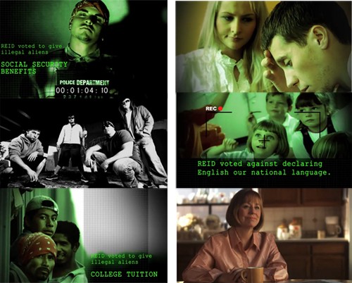 In her newest attack ad, Angle pits brown against white in order to make the case that Reid is a friend of dark-skinned, scary looking “illegal aliens” and an enemy of white Nevadans like her: