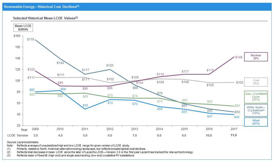 A widely-used yearly benchmarking study — the Levelized Cost of Energy Analysis (LCOE) from the financial firm Lazard Ltd. — reached this stunning conclusion: In many regions “the full-lifecycle costs of building and operating renewables-based projects have dropped below the operating costs alone of conventional generation technologies such as coal or nuclear.”