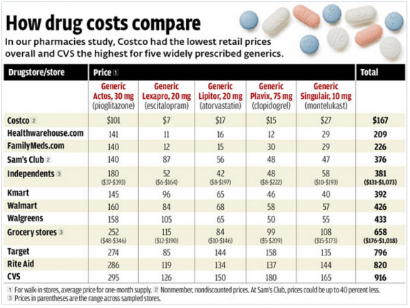 Costco was the least expensive overall, and you don’t need to be a member to use its pharmacy. A few independent pharmacies came in even cheaper, though their prices varied widely, as did grocery-store pharmacies. The online retailers Healthwarehouse.com and FamilyMeds.com also had very low prices. On the other end of the spectrum, CVS, Rite Aid, and Target had the highest retail prices. […]A representative of CVS told us that its retail drug prices reflect other services offered by the chain, including drive-through windows, automated prescription refill systems, free outreach programs to help make sure patients are taking their prescriptions correctly, and 24-hour pharmacies. Costco pharmacies, the cheapest overall, are open only from 10 a.m. to 7 or 8:30 p.m. and are typically closed on Sundays.