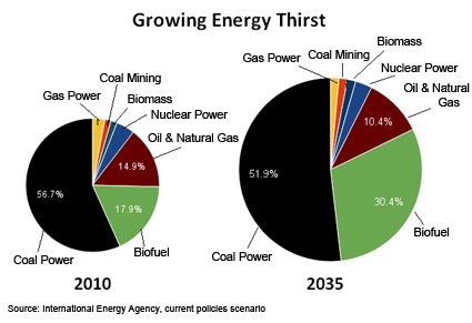 More than half of that drain would be from coal-fired power plants and 30 percent attributable to biofuel production, in IEA’s view. The agency estimates oil and natural gas production together would account for 10 percent of global energy-related water demand in 2035….